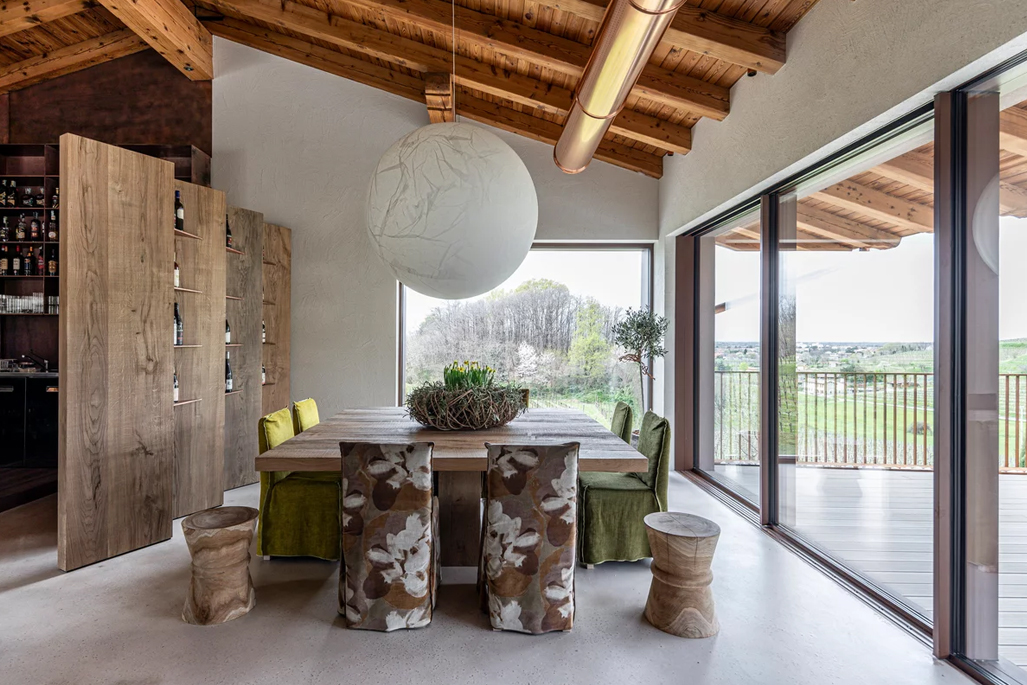 Rather than creating contrast, the project embraces its context - vineyards, natural light, and raw materials become part of the spatial experience.